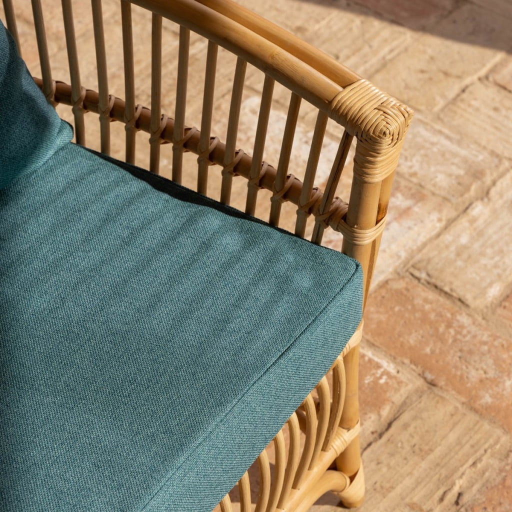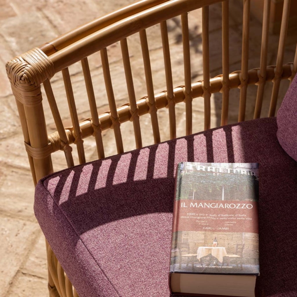 Mykonos Sessel handgefertigt aus natürlichem Manao und Rattan mit originellem Design von Rosa Splendiani. Die offenen und minimalistischen Linien verbinden sich mit der klassischen Gesamtform und verleihen diesem Rattansessel eine einzigartige Raffinesse, die sich mit jedem Einrichtungsstil verbinden lässt.